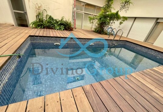 Το ευρύχωρο σαλόνι βρίσκεται και στα δύο επίπεδα με παράθυρα και μπαλκόνια προς το κλειστό αίθριο και τον ιδιωτικό, υπαίθριο κήπο. Στο δεύτερο επίπεδο είναι η τραπεζαρία η κουζίνα πλήρως εξοπλισμένη με συσκευές Gagenau. Η κύρια κρεβατοκάμαρα διαθέτει ensuit ντουλάπα και μπάνιο. Πισίνα με ψηφιδωτά πλακάκια. Ιδιωτική πύλη κήπου που δίνει άμεση πρόσβαση στο προστατευόμενο πευκοδάσος του λόφου του Λυκαβηττού. Επιπλωμένο Ευρώ 8.800/μήνα